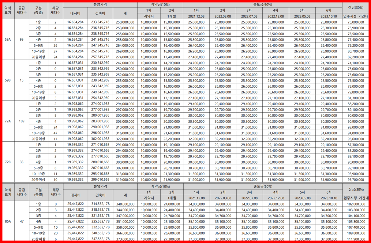 분양타입 : 59A / 59B / 72A / 72B / 85A