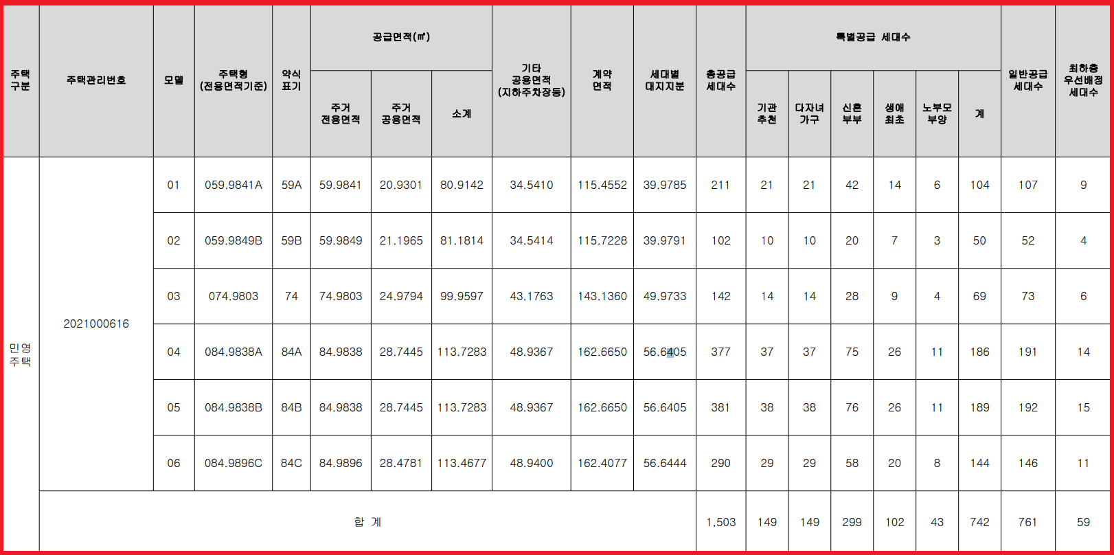 [특별공급 742세대(일반(기관추천) 149세대, 다자녀가구 149세대, 신혼부부 299세대, 노부모부양 43세대, 생애최초 102세대 포함)] 및 북대복리시설