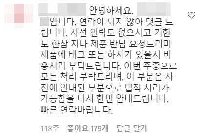 한 PR 대행사가 올린 댓글로 협찬 제품을 반납하라는 내용이다.