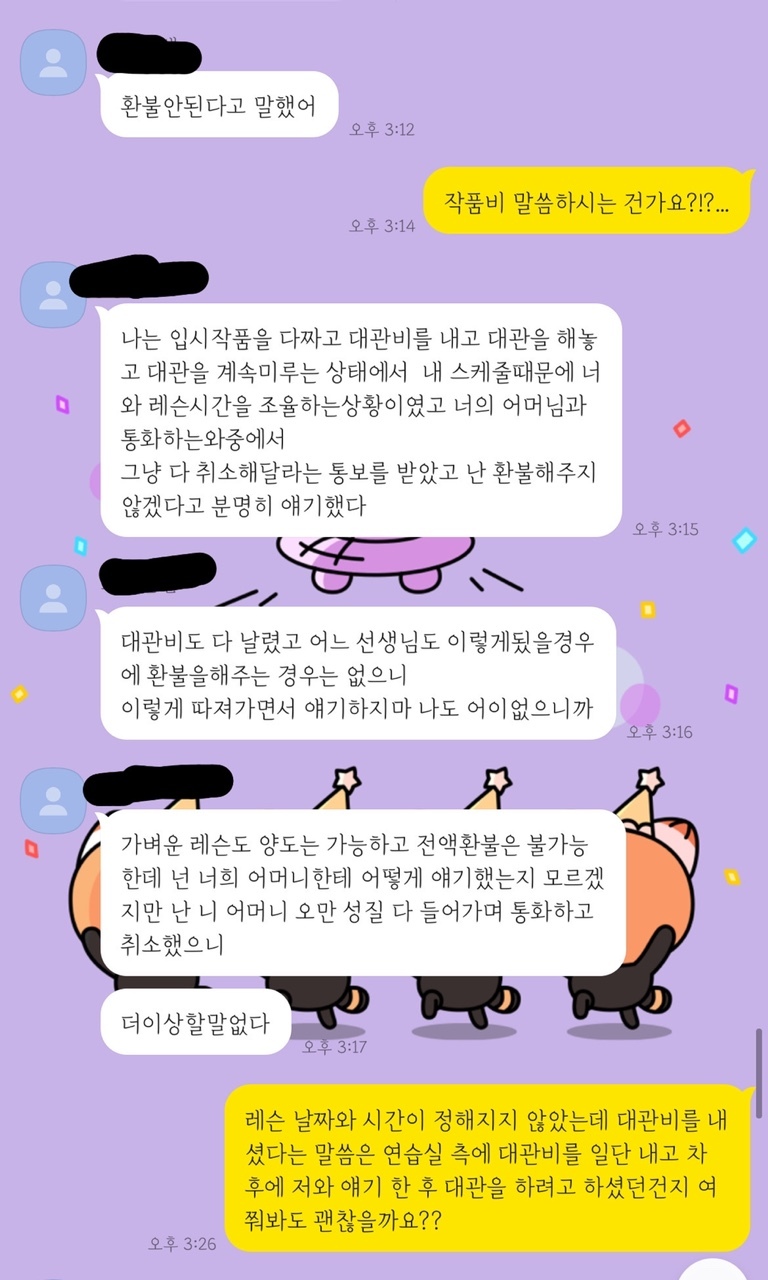 이에 로잘린은 "이미 입시 작품을 창작했다. 그 작품을 창작하면서 쓴 시간 등 고생한 게 있으니 작품비는 환불해 줄 수 없고 대관비 또한 미리 대관을 하는 과정에서 이미 지불해버렸기에 돌려줄 수 없다"라고 말하며 레슨비를 50만 원만 환불해 주기로 했다.