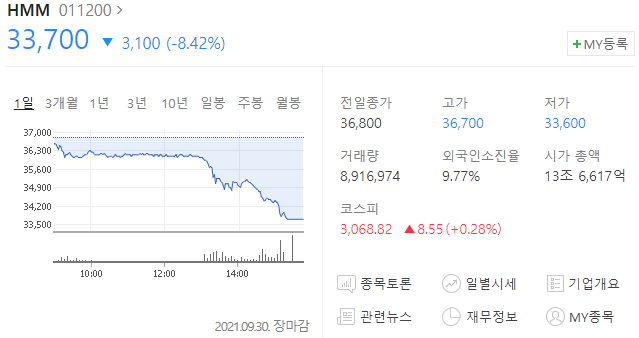 HMM 주가가 하루 만에 -8.52% 하락, 그야말로 급락하였다.