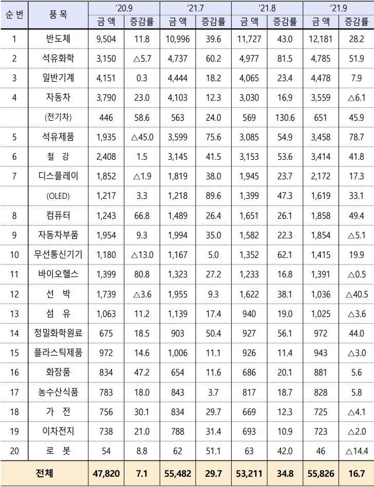 - 작년 9월은 코로나19 이후 수출이 처음 증가 했었고 조업일수도 올해 9월이 2일이 적음에도 전년 대비 두자리 증가