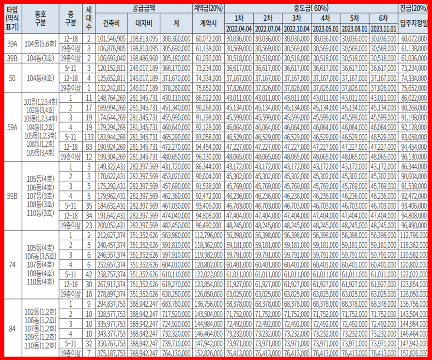 분양타입 : 39A / 39B / 50 / 59A / 59B / 74 / 84