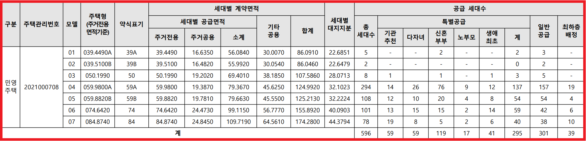 [특별공급 295세대(일반[기관추천] 59세대, 다자녀가구 59세대, 신혼부부 119세대, 노부모부양 17세대, 생애최초 41세대 포함)] 및 부대복리시설