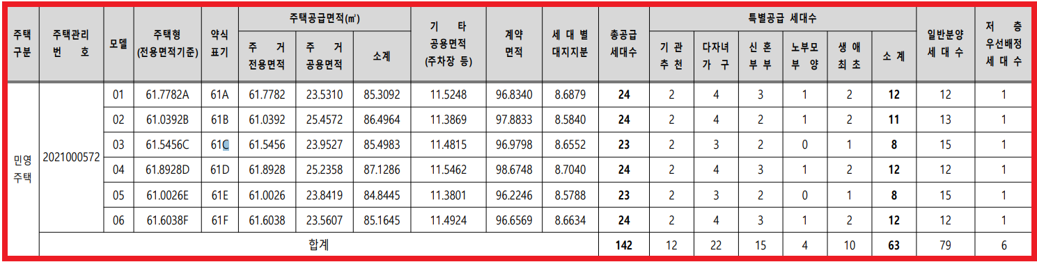 특별공급 63세대(일반[기관추천] 12세대, 다자녀가구 22세대, 신혼부부 15세대, 노부모부양 4세대, 생애최초 10세대 포함)
