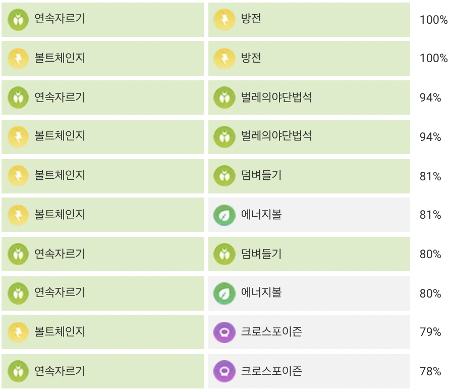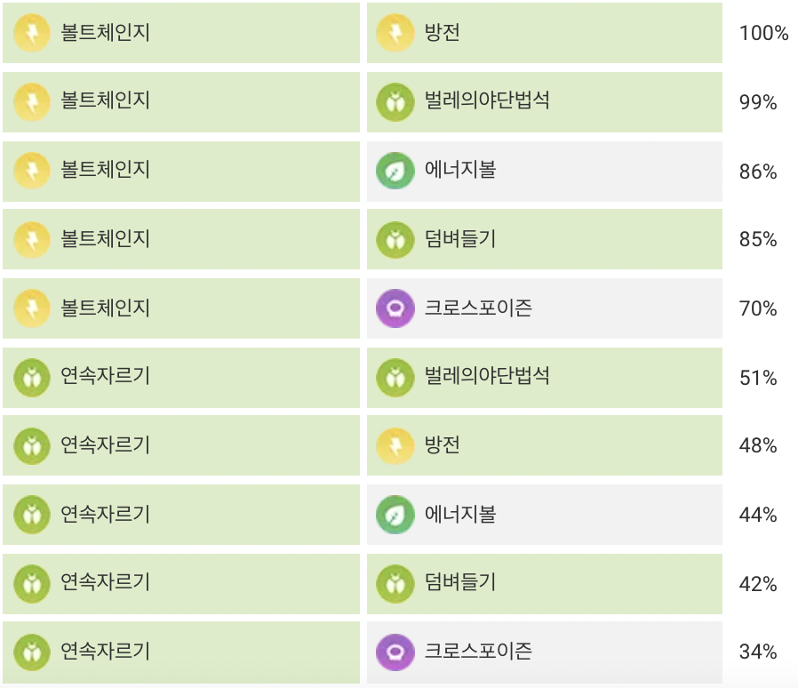 풀, 에스퍼, 고스트 < 벌레 < 불꽃, 비행, 바위