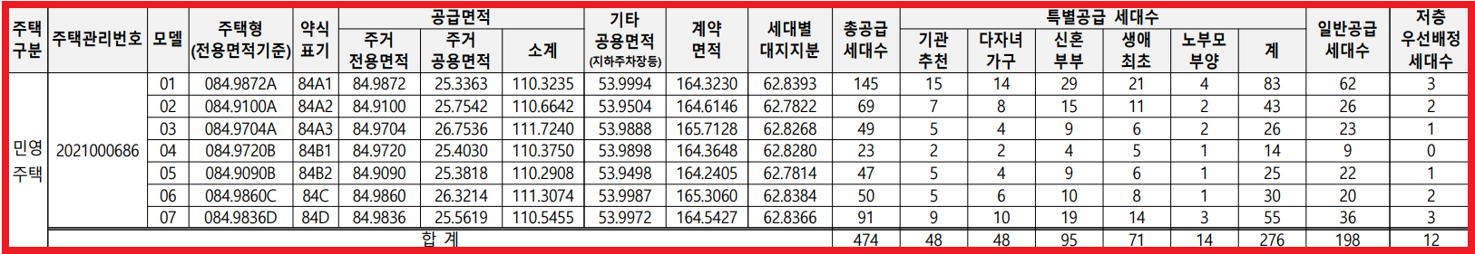 [특별공급 276세대 (기관추천 특별공급 48세대, 다자녀가구 특별공급 48세대, 신혼부부 특별공급 95세대, 생애최초 주택 구입자 특별공급 71세대, 노부모부양자 특별공급 14세대 포함)]