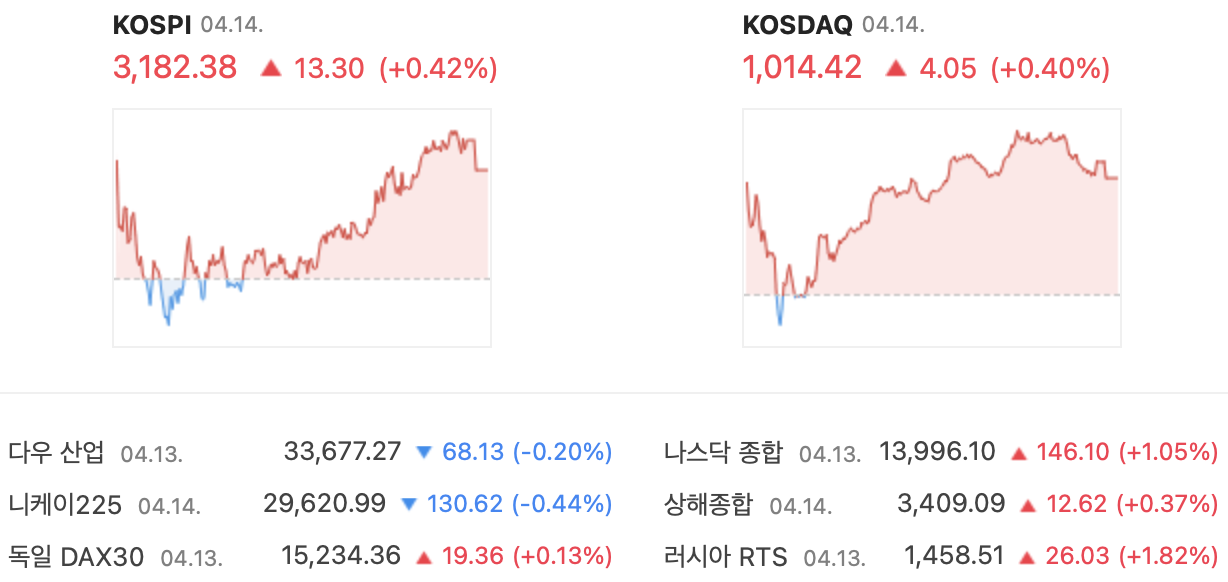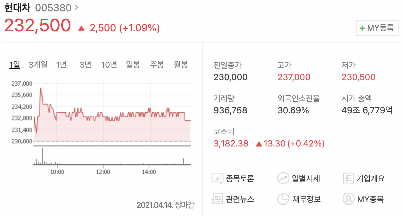 4월 14일 한국 증시 마감 시황(특징주 - 와이아이케이, 현대차, 포스코엠텍, 웰크론한텍, 현대무벡스, 하이브) 주가