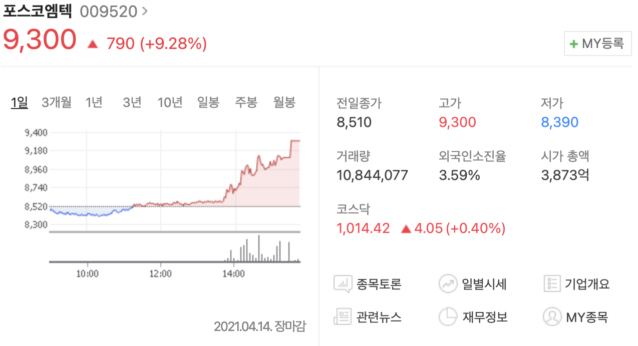 포스코엠텍(009520) 주가 9,300원(+9.28%)