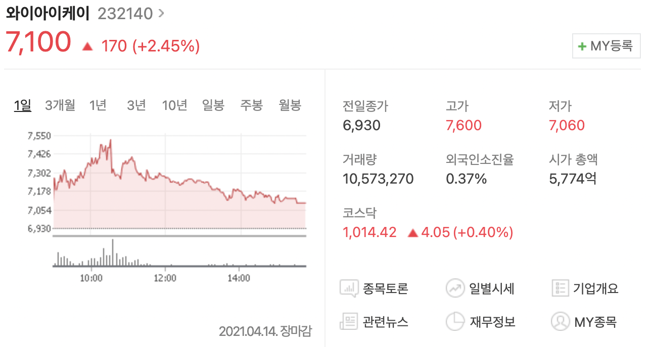 반도체 테스트장비 기업인 와이아이케이가 삼성전자와 531억원 규모의 공급계약 소식에 강세를 보이고 있다. 14일 한국거래소에 따르면 와이아이케는 전일대비 270원(3.9%) 오른 7200원에 거래되고