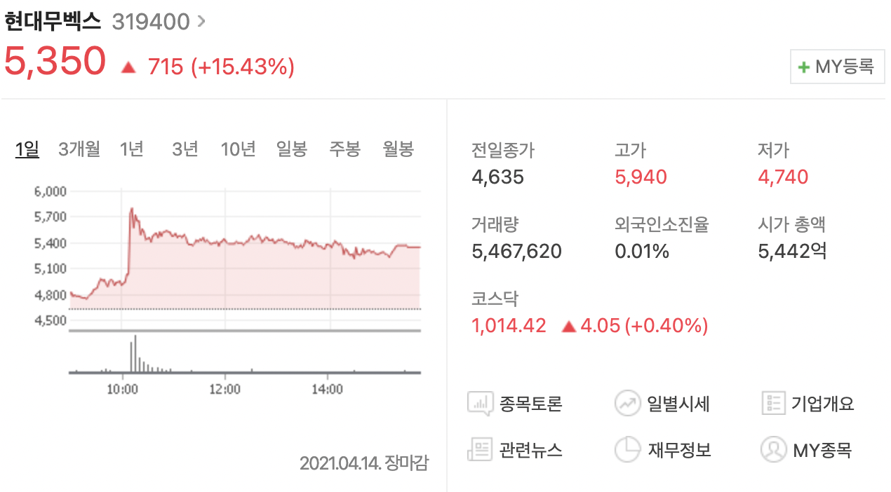 현대무벡스(319400) 주가 5,350원(+15.43%)