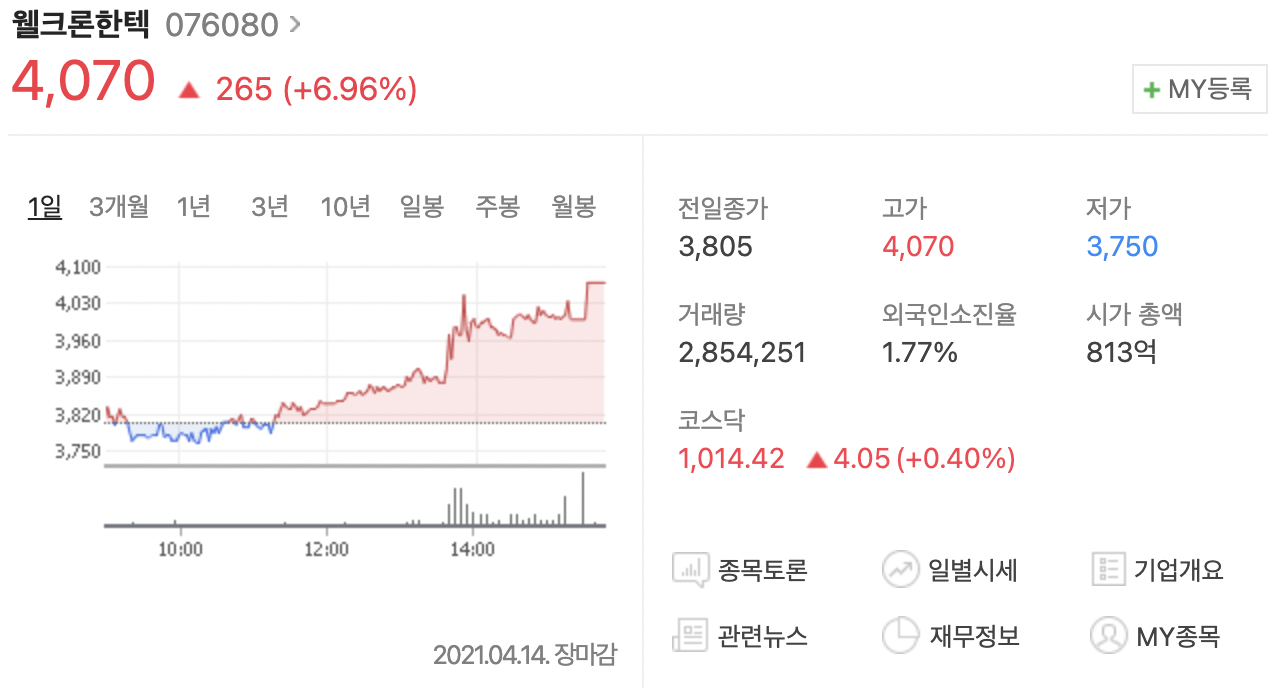 웰크론한텍(076080) 주가 4,070원(+6.96%)
