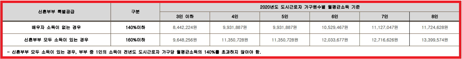 - 소득기준 : 해당 세대의 월평균 소득이 전년도 도시근로자 가구원수별 월평균소득(4명 이상 세대는 가구원수별 가구당 월평균소득을 말한다) 기준의 140%이하인 자(신혼부부 모두 소득이 있는 경우 160% 이하)