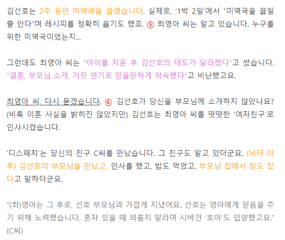 내용을 보자면 최영아가 김선호와 사귈 때 이혼했다는 사실을 뒤늦게 알렸으며 김선호가 최영아의 남주 문제로 힘들어했다고 보도했다.