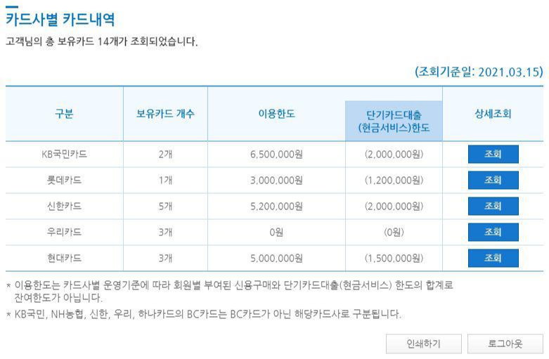 어우 조회 결과.. 무슨 안 쓰는 신용카드가 이렇게도 많은지