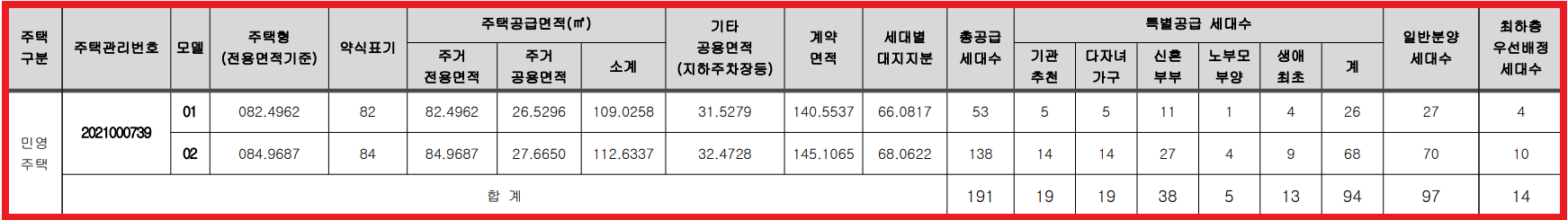 [특별공급 94세대(일반[기관추천] 19세대, 다자녀가구 19세대, 신혼부부 38세대, 노부모부양 5세대, 생애최초 13세대 포함)] 및 부대복리시설