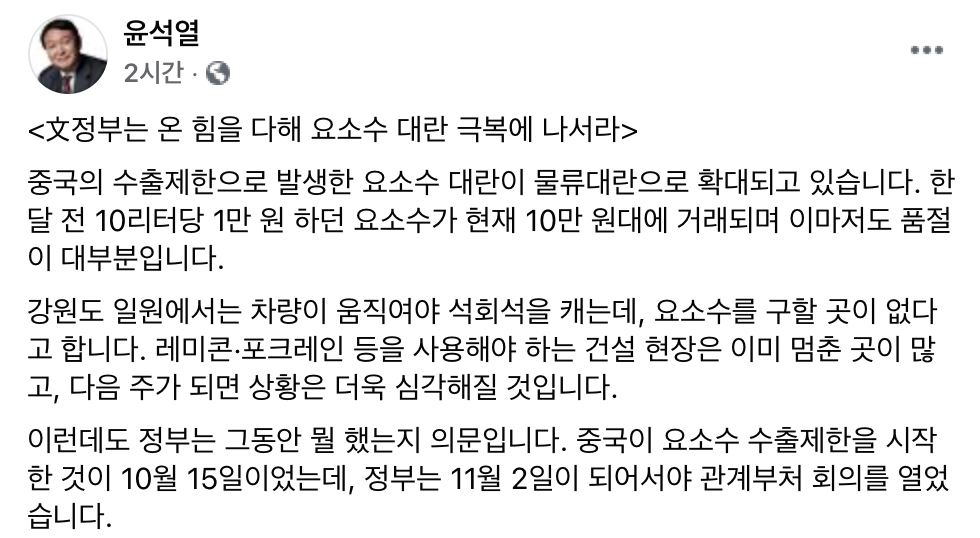 윤석열 전 검찰총장은 페이스북 글에서 "정부는 지금이라도 대 중국 특사단을 준비하고 모든 외교적 노력을 기울여라"며 "중국이 요소수 수출 제한을 지난달 15일 시작했는데 정부는 18일이 지난 이달 2일에서야 관계부처 회의를 열었다"라고 지적했다.