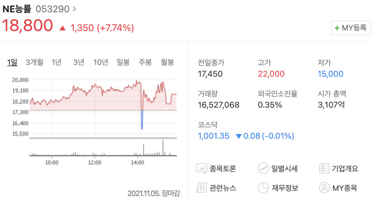 그렇다면 윤석열의 대표 관련주 NE능률의 주가는?