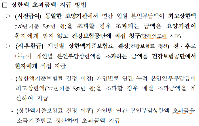 상한액 기준 보험료 결정 이전에는 개인별로 연간 누적 본인 일부 부담금이 최고 상한액 582만 원을 초과할 경우에 한해서만 월 초과금액을 계산해서 지급합니다.