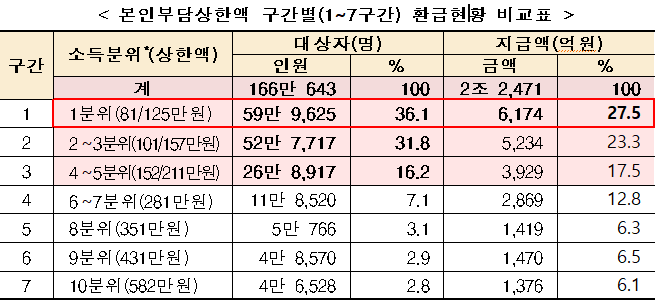 그래서 보도자료에 보면 7구간에 해당되는 약 17만 명은 이미 지급을 완료했다고 나오는데요 상한액 기준 보험료 결정 이후에는 개인별 연간 본인 부담 상한액 초과금을 소득 기준별로 정산해서 초과금을 지급합니다.