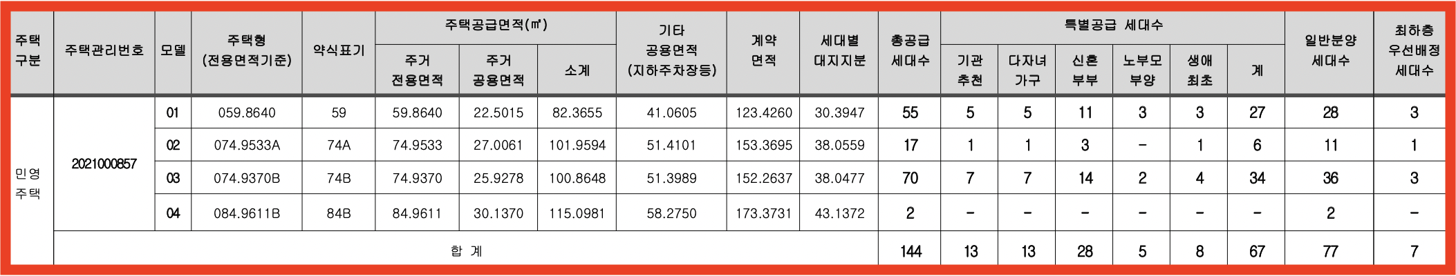 [특별공급 67세대(일반[기관추천] 13세대, 다자녀가구 13세대, 신혼부부 28세대, 노부모부양 5세대, 생애최초 8세대 포함)] 및 부대복리시설