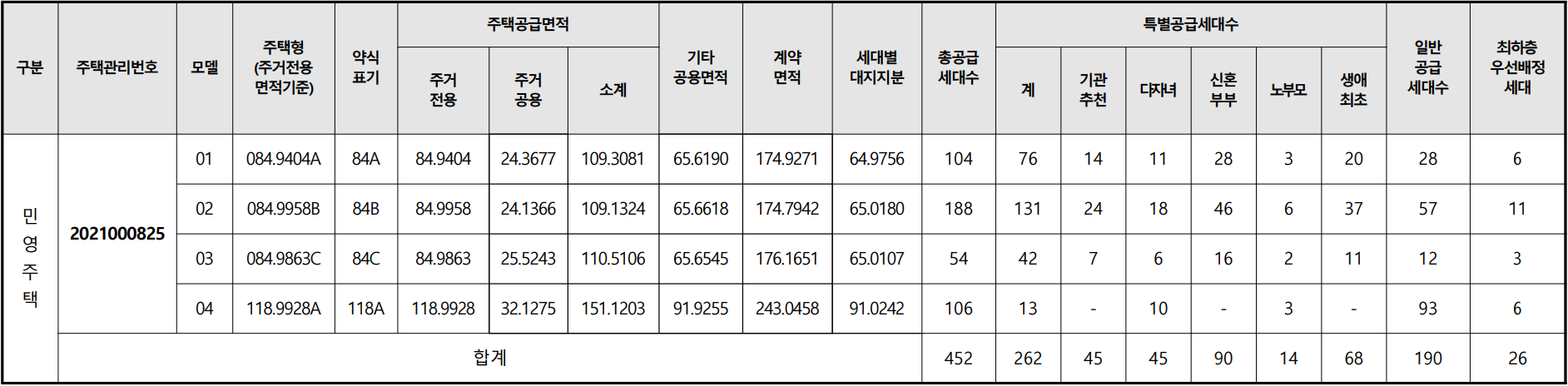 공급규모 : 아파트 지하 2층 ~ 지상 최고 18층, 8개 동 총 452세대