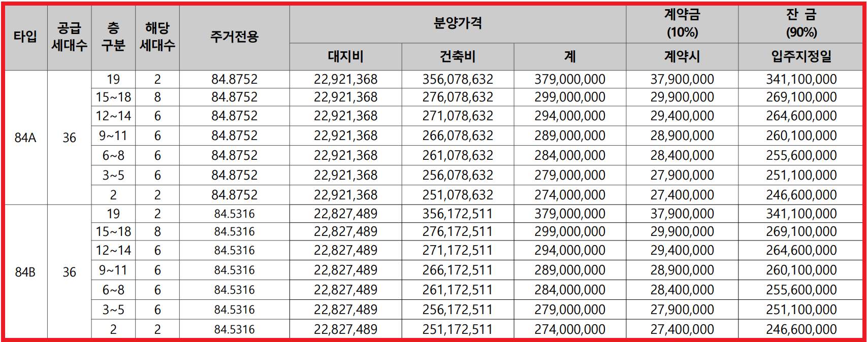 84㎡A(36세대) 최저가 2억 7400만 원, 최고가 3억 7900만 원