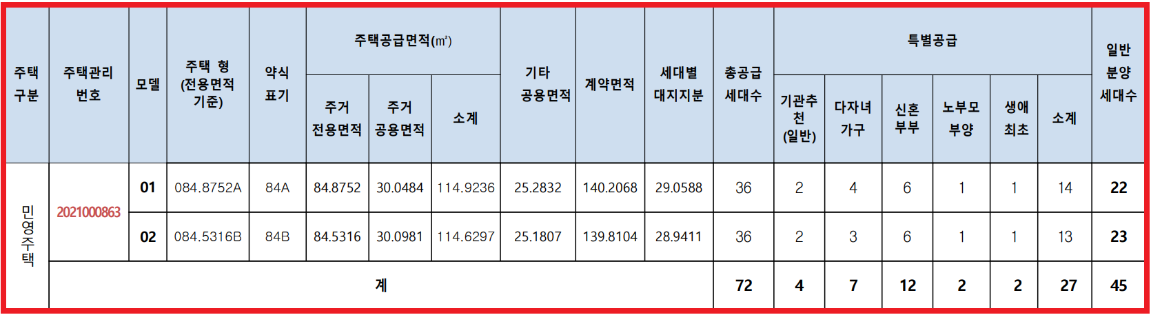 공급규모 : 아파트 지상 19층, 1개동 72세대 중 일반공급 45세대, 특별공급 27세대(일반[기관추천] 4세대, 다자녀가구 7세대, 신혼부부 12세대, 노부모부양 2세대, 생애최초주택 2세대 포함) 및 부대복리시설