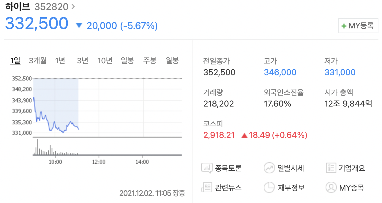 망할 놈의 오미크론 등장과.. 지난달 28일 윤석준 하이브 아메리카 CEO의 주식 처분, 그리고 오늘 방탄소년단(BTS) 멤버들의 매도 이슈로 좋지 않은 상황입니다.