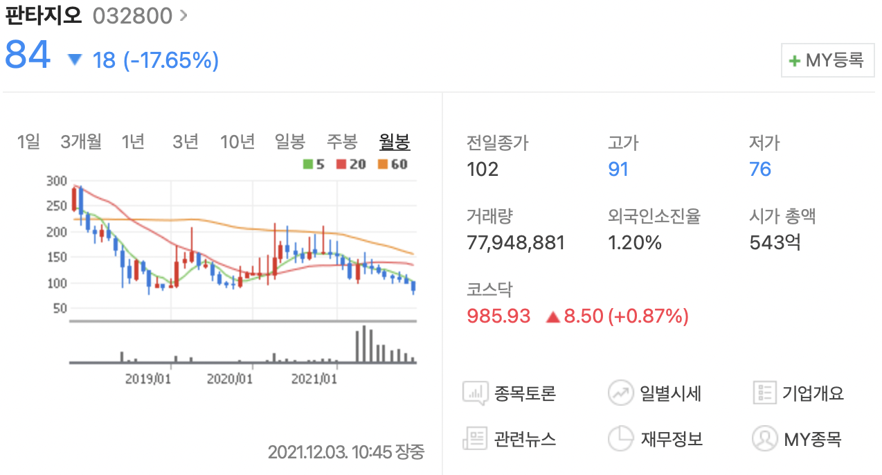 거의 상폐될껏처럼 나날이 하락하고 있는 판타지오..