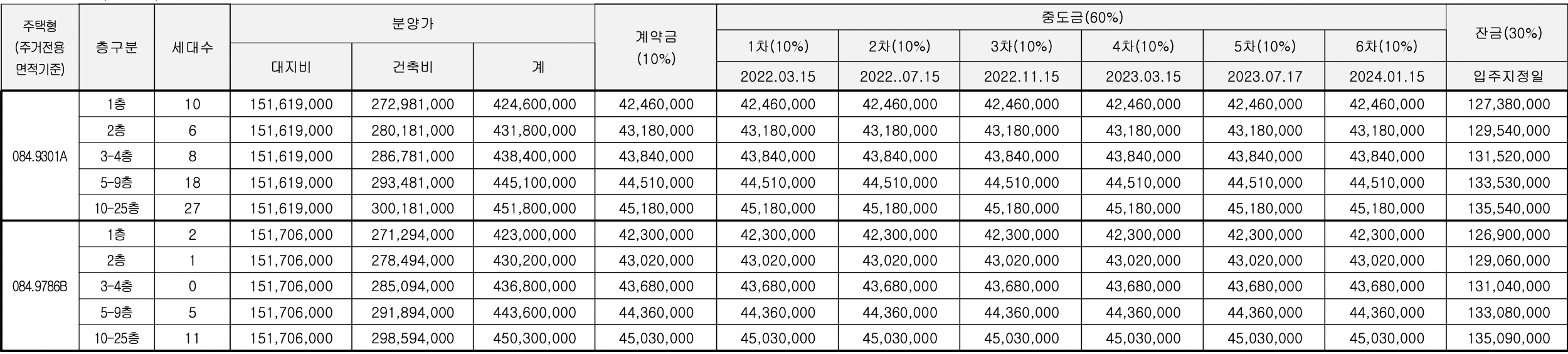 84㎡A(69세대) : 최저가 - 4억 2460만 원, 최고가 - 4억 5180만 원