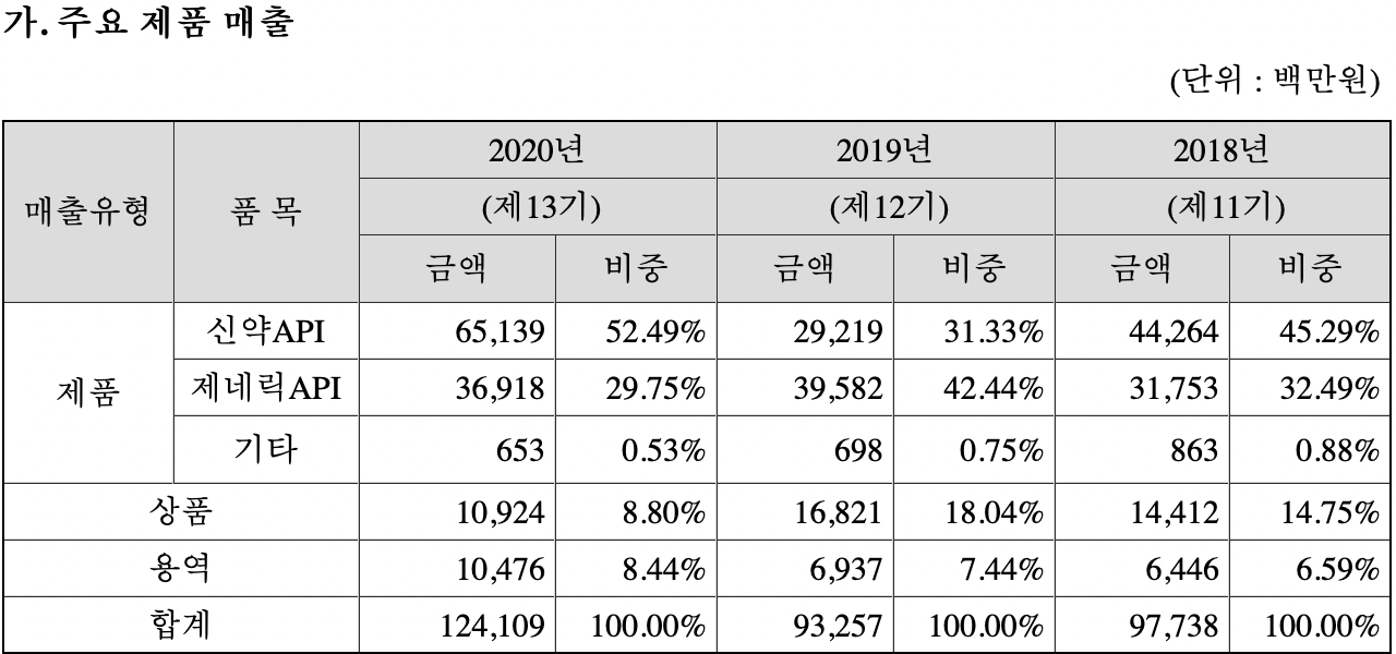 신약 원료의약품 및 제네릭 원료의약품을 판매하고 있으며 주요 제품은 C형간염치료제 원료의약품 및 올리고 핵산치료제 원료의약품임.
