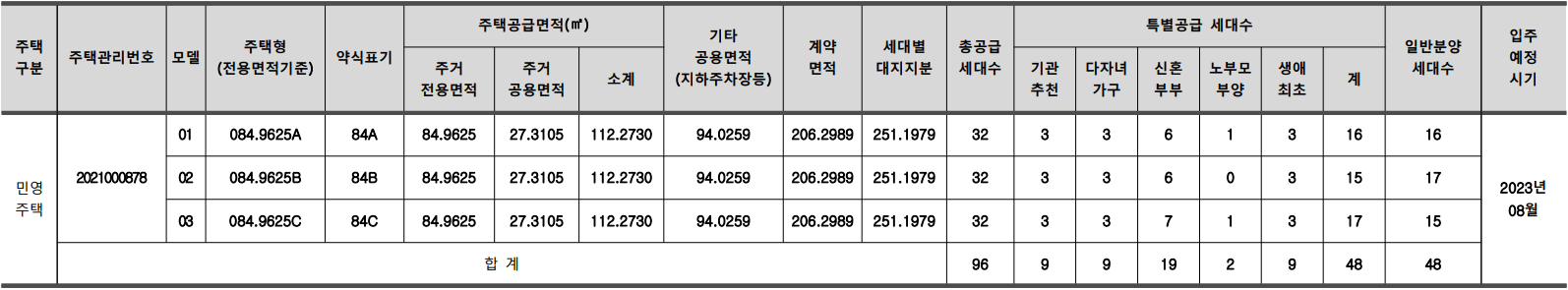 [특별공급 48세대(일반[기관추천] 9세대, 다자녀가구 9세대, 신혼부부 19세대, 노부모부양 2세대, 생애최초 9세대 포함) 및 부대복리시설