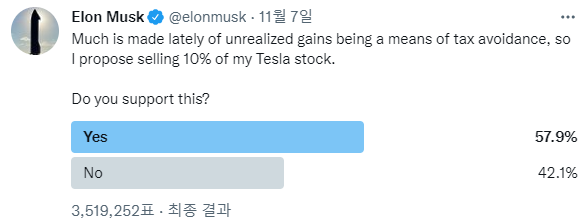 이에 일론 머스크는 11월 7일 트위터 팔로워들에게 테슬라 지분 10% 처분 여부를 묻는 설문조사에서 응답자의 57.9%가 지분 처분에 찬성표를 던지자 대규모 주식 매각을 진행했고 지금까지 140억 달러(약 16조 6590억 원)규모의 주식을 팔고 있는 상황입니다.