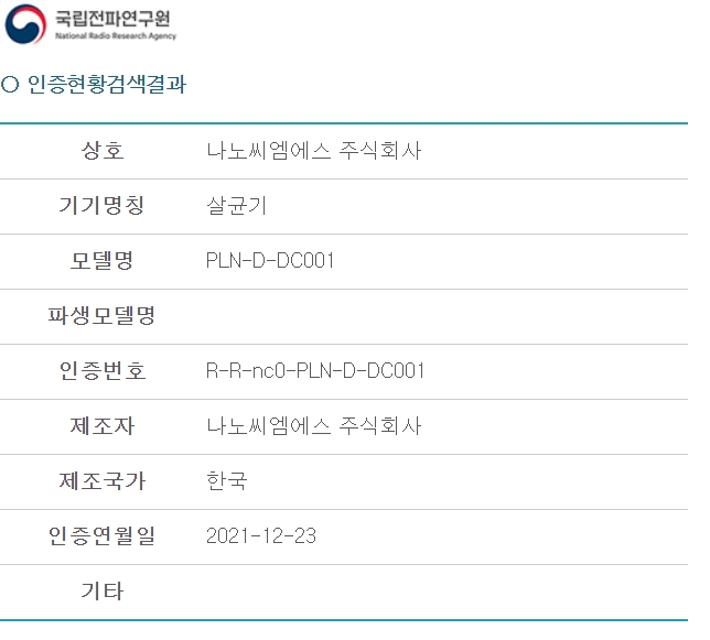 이유로는 자사 홈페이지에 공지한 모델명 'PLN-D-DC001' 살균기의 국립전파인증 획득' 때문으로 추측하고 있다.