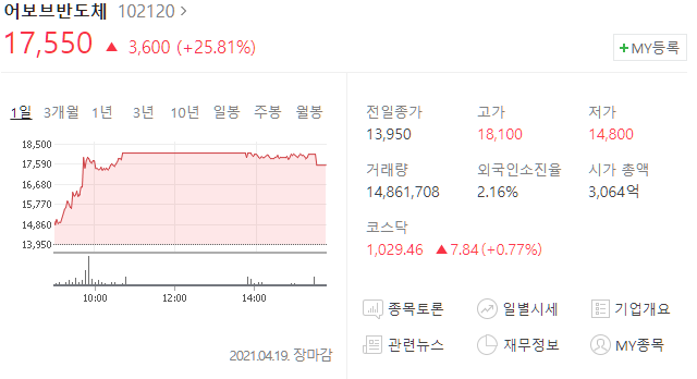 어보브반도체(102120) 주가 17,550원(+25.81%)