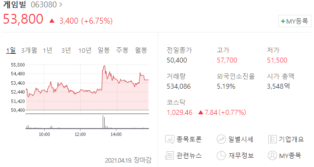 게임빌(063080) 주가 53,800원(+6.75%)