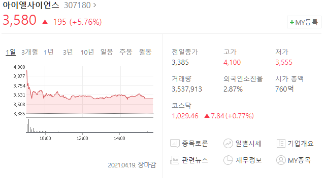 아이엘사이언스(307180) 주가 3,580원(+5.76%)