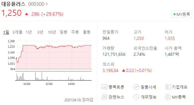 대유플러스(000300) 주가 1,250원(+29.67%)
