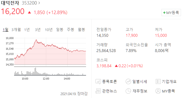 대덕전자(353200) 주가 16,200원(+12.89%)