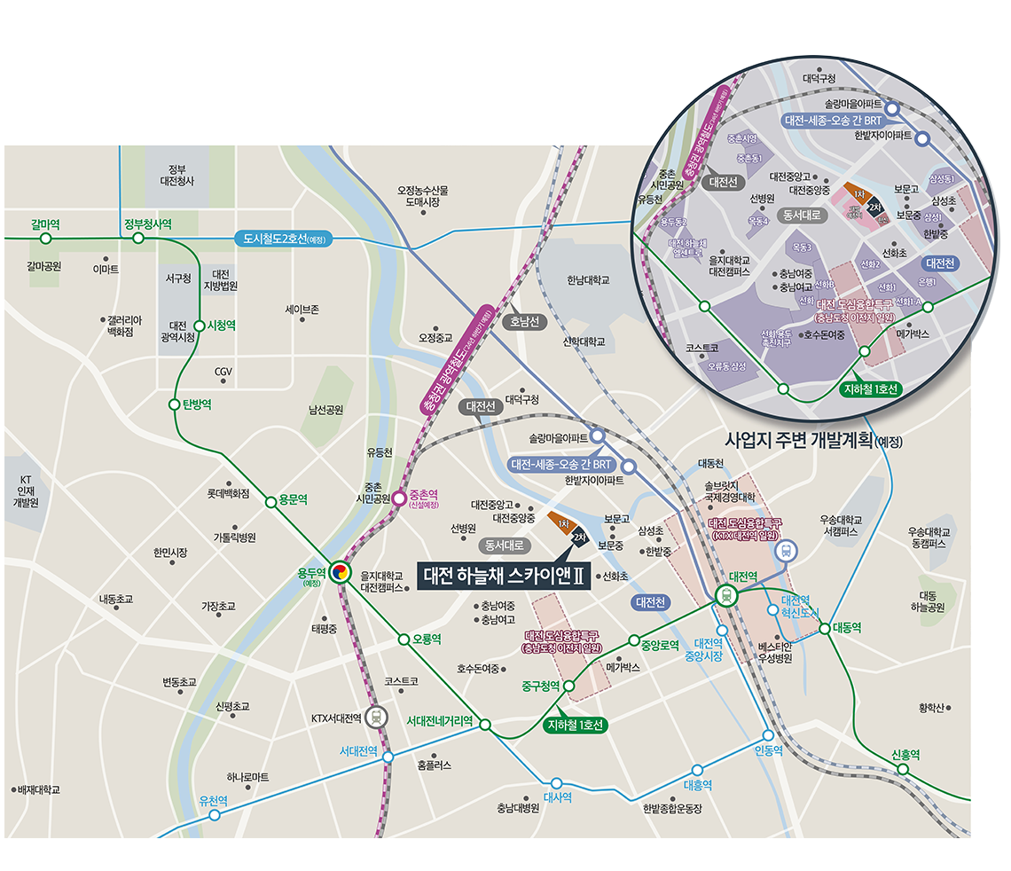 - 1호선 중앙로역과 KTX 대전역, BRT(대전-세종-오송 간), 충청권 광역철도(개통예정) 등