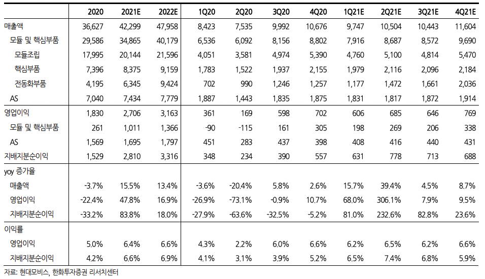 - 현대모비스의 손익의 70%를 차지하고 있는 A/S 사업부는 2Q21부터 이동수요 증가에 따라 회복세를 보일 전망