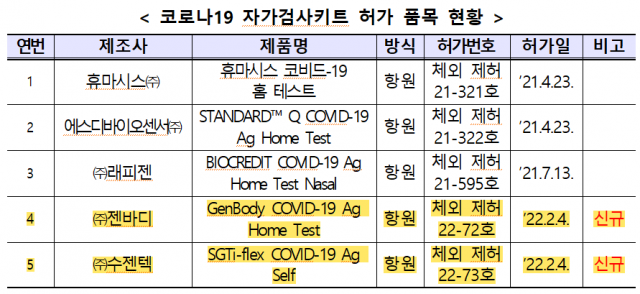 표 제공=식품의약품안전처식품의약품안전처는 4일 코로나19 자가검사키트 2개 제품을 추가 허가했다. 이에 따라 국내에서는 기존의 에스디바이오센서(137310), 휴마시스(205470), 래피젠 제품을 포
