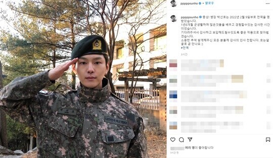 또한 박선호는 자신의 인스타그램에 "충성! 병장 박선호는 2022년 2월 9일부로 전역을 명 받았습니다"라며 사진을 게재했다.
