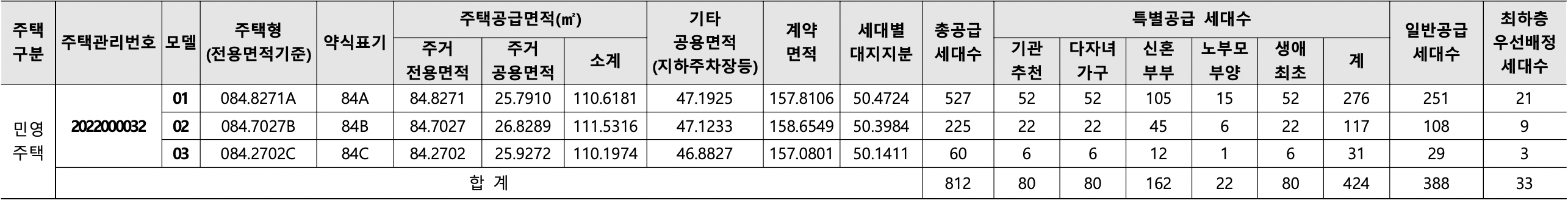 [특별공급 424세대(일반[기관추천] 80세대, 다자녀가구 80세대, 신혼부부 162세대, 노부모부양 22세대, 생애최초 80세대 포함)]