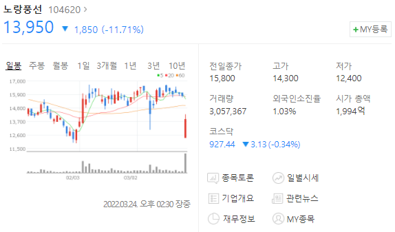 노랑풍선이 매출 부진에 따른 코스닥시장 관리종목으로 지정되어 급락하고 있다.