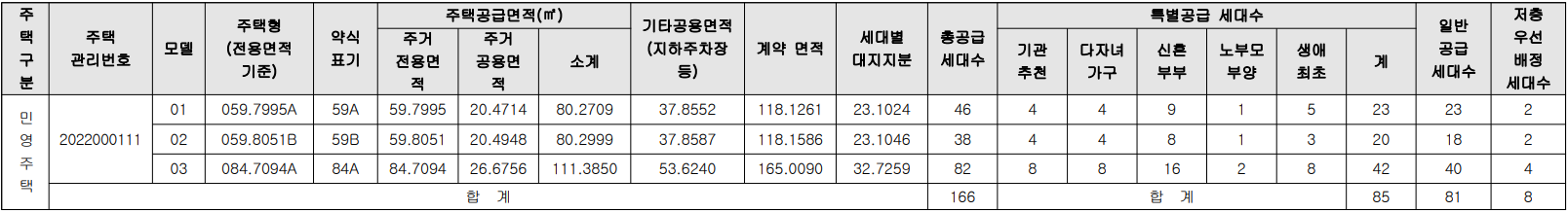 [특별공급 총 85세대[일반(기관추천) 특별공급 16세대, 다자녀가구 특별공급 16세대, 신혼부부 특별공급 34세대, 노부모부양 특별공급 4세대, 생애최초 특별공급 16세대]