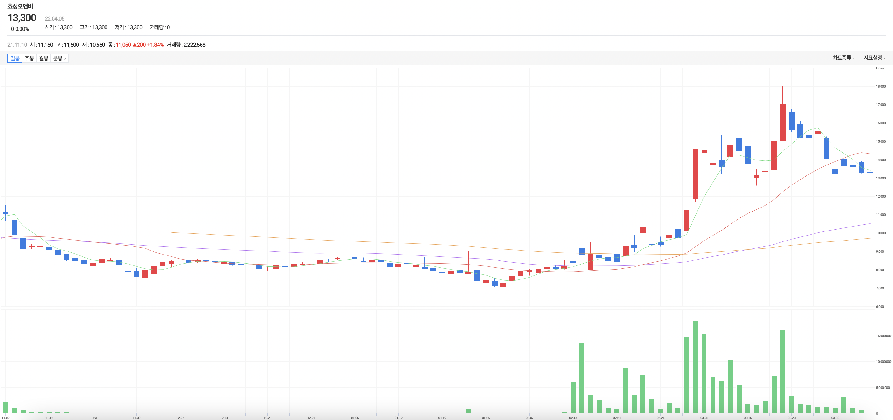 급등 후 계속해서 하락하고 있는 효성오앤비의 주가.. 다시 상승 랠리 시작인가?