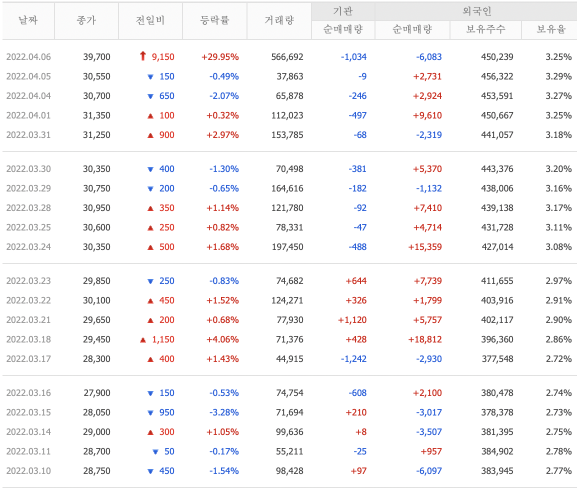 4월 6일 시간외 역시 상한가를 기록하며 마무리 되었다.