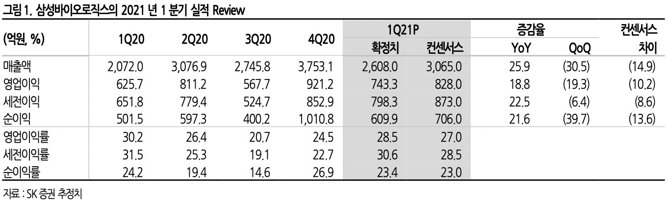 - 21년 1분기 실적 매출액 2,608억 원, 영업이익 743억 원으로 모두 시장 컨센서스 하회하는 실적